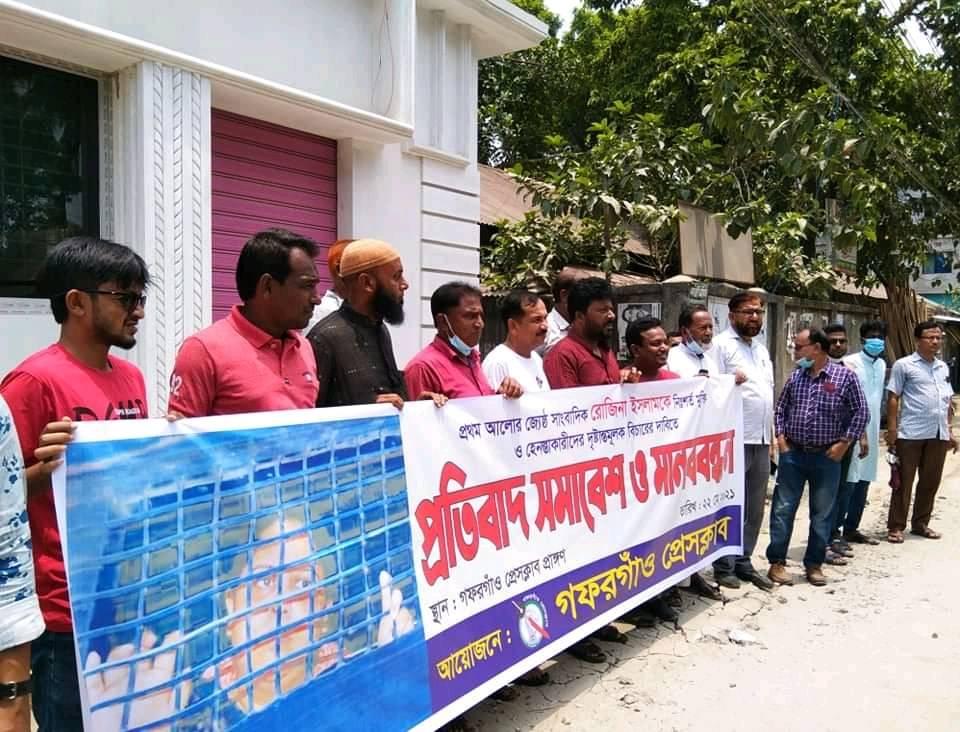 প্রেসক্লাবের সামনে গফরগাঁও প্রেসক্লাব, গফরগাঁও রিপোর্টার্স ইউনিটির সাংবাদিকেরা-সহ অন্যান্য সাংবাদিকগন অংশ নেয়। গফরগাঁও প্রেসক্লাবের সভাপতি আব্দুল্লাহ আল-আমীন বিপ্লবের সভাপতিত্বে ও সাধারণ সম্পাদক তফাজ্জল হোসেনের সঞ্চালনায় মানববন্ধনে বক্তব্য রাখেন গফরগাঁও প্রেস ক্লাবের সাবেক সভাপতি আতাউর রহমান মিন্টু, শফিউল আলম মারুফ, আজিম উদ্দিন, আব্দুল আউয়ালসহ অন্যান্য নেতৃবৃন্দ। প্রতিবাদ ও মানববন্ধন কর্মসূচিতে উপজেলার বিভিন্ন প্রিন্ট ও ইলেক্ট্রনিক মিডিয়ার সাংবাদিকরা উপস্থিত ছিলেন।